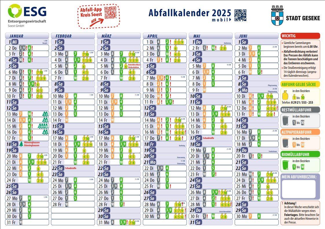 Die von der Entsorgungswirtschaft Soest GmbH (ESG) in enger Abstimmung mit den Kommunen des Kreises Soest herausgegebenen Abfallkalender für 2025 werden überwiegend digital angeboten. Der Abfallkalender der Stadt Geseke kann als pdf-Datei von der Webseite der ESG (www.esg-soest.de) unter „Service/Downloads“ und „Angebote in Kommunen“ heruntergeladen werden.