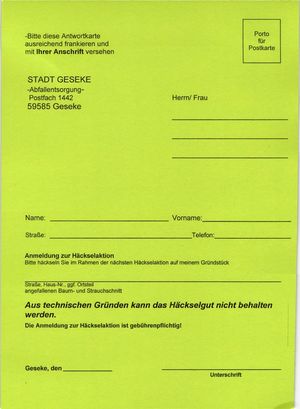 Die Anmeldung erfolgt über das Ausfüllen und Einreichen einer grünen Häckselkarte, die bei sämtlichen Geldinstituten und in der Stadtverwaltung erhältlich ist. Bei der Abgabe der Anmeldung ist die Gebühr in Höhe von 20,00 Euro in bar zu bezahlen. Abgegeben werden können die Karten am Empfang der Stadt Geseke, An der Abtei 1 oder im Bürgerbüro, Mühlenstraße 11. Ganz bequem von zu Hause aus, kann sich aber auch über das Online-Serviceportal der Stadt Geseke https://serviceportal.geseke.de/services angemeldet werden. Die Gebühr wird dann direkt über Paypal gezahlt.