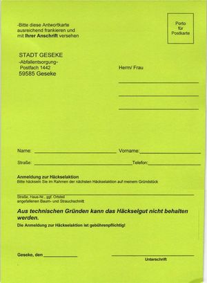 Die Anmeldung erfolgt über das Ausfüllen und Einreichen einer grünen Häckselkarte, die bei sämtlichen Geldinstituten und in der Stadtverwaltung erhältlich ist. Bei der Abgabe der Anmeldung ist die Gebühr in Höhe von 20,00 Euro in bar zu bezahlen. Abgegeben werden können die Karten am Empfang der Stadt Geseke, An der Abtei 1 oder im Bürgerbüro, Bachstraße 4.