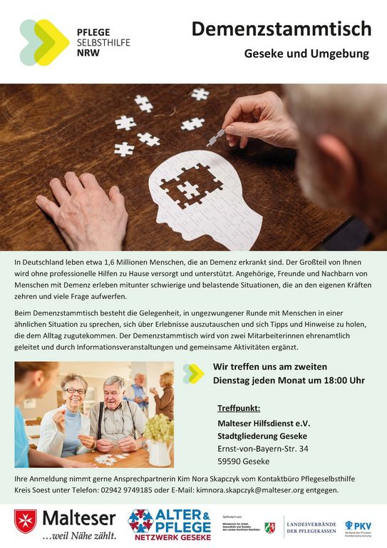 Hier besteht die Gelegenheit, in ungezwungener Runde mit Menschen zu sprechen, die sie verstehen, sich über Erlebnisse auszutauschen und sich Tipps und Hinweise zu holen, die ihrem Alltag zugutekommen. Als Ansprechpartnerin begleitet Frau Vollmer-Stracke vom Demenznetz Geseke den Stammtisch.