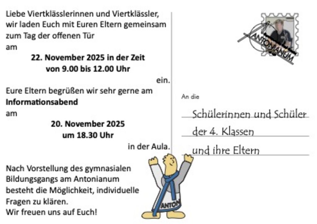Das Gymnasium Antonianum öffnet wieder seine Pforten und begrüßt eine Woche vor dem ersten Advent interessierte Eltern und Schülerinnen und Schüler zum Tag der offenen Tür. Am Samstag, den 22.11.25, bieten Lehrerinnen und Lehrer sowie zahlreiche Schülerinnen und Schüler einen Einblick in die vielfältige, innovative Schullandschaft des Gymnasiums.