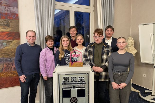 Das Projekt „Erforschung und Sichtbarmachung der Geseker Landwehranlagen“ der Arbeitsgemeinschaft Geschichte des Gymnasiums Antonianum wurde mit dem 1. Platz ausgezeichnet. Lukas Müller, Amelie Unrau, Katharina Auge und Marie Starkgraff haben die historischen Landwehranlagen erforscht und möchten ihre Ergebnisse an sechs ausgewählten Stationen mit Info-Tafeln sichtbar und für die Öffentlichkeit zugänglich machen. Neben der Erarbeitung von Definitionen und historischen Hintergründen planen die Achtklässler außerdem eine Fahrradroute und noch weitere Aktionen für Kinder und Familien. Betreut werden die Schülerinnen und Schüler von den Lehrkräften Alexa Hilwerling und Alexander Baimann. Lukas, Amelie, Katharina und Marie werden sich mit ihrem Projekt auch am Geschichtswettbewerb des Bundespräsidenten bewerben. Der Geschichtswettbewerb des Bundespräsidenten ist der größte historische Forschungswettbewerb für junge Menschen in Deutschland. Alle zwei Jahre rufen der Bundespräsident und die Körber-Stiftung Kinder und Jugendliche zur historischen Spurensuche vor Ort auf. „Ihr leistet mit Eurem Projekt einen tollen Beitrag zur Sichtbarmachung unserer Heimat und erfüllt zu 100% die Vorgaben des Heimatpreises. Ich gratuliere Euch ganz herzlich und freue mich, dass Ihr Euch mit diesem Projekt auch für den Landeswettbewerb qualifiziert habt,“ so Bürgermeister Dr. Remco van der Velden.