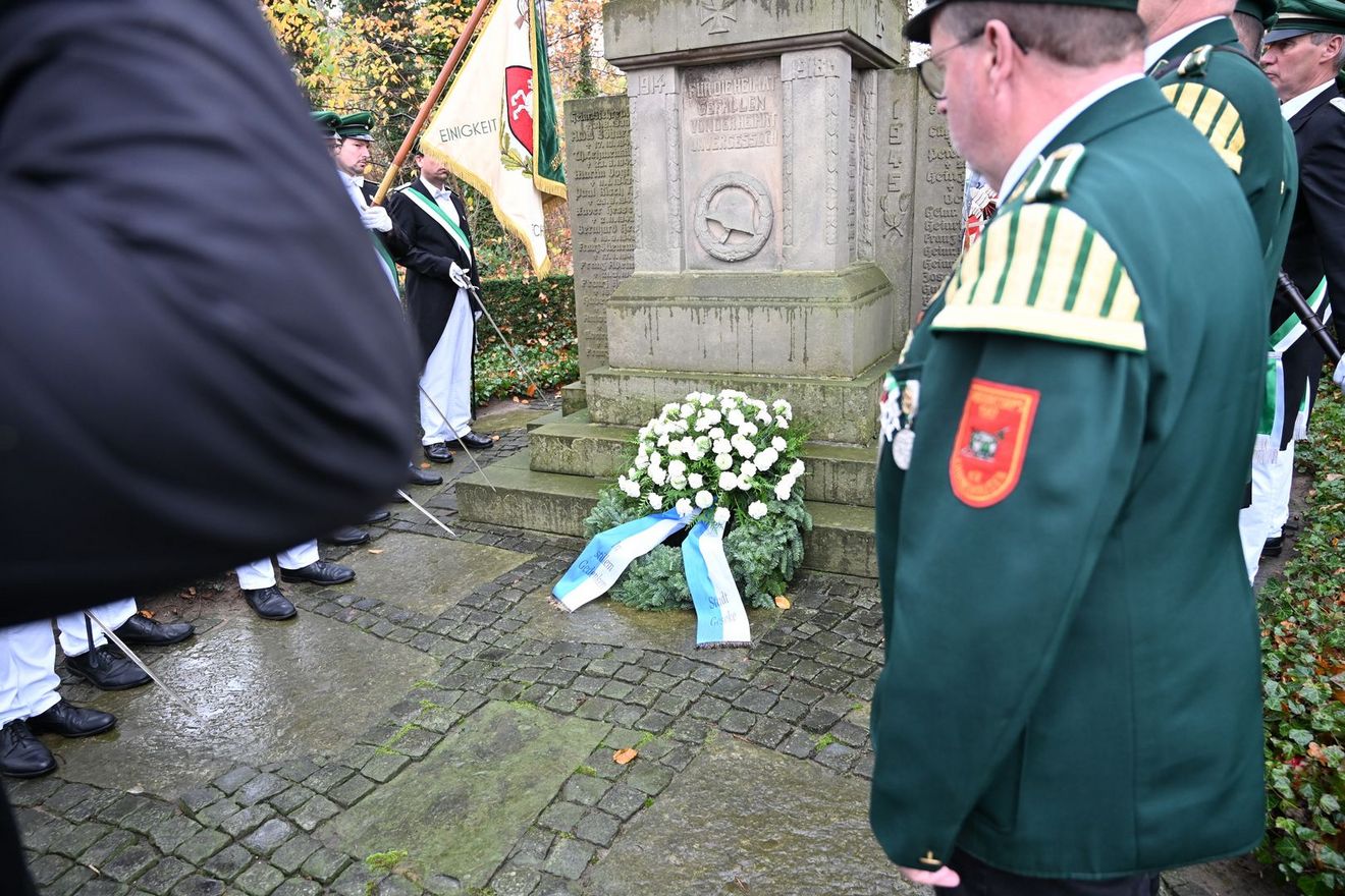 Im Anschluss an die Rede folgte die Kranzniederlegung am Ehrenmal. In stillem Gedenken gedachten die Anwesenden der Toten der Weltkriege und der Opfer von Diktatur, Verfolgung und Vertreibung. Bürgermeister Dr. Remco van der Velden bedankte sich bei der St.-Jakobus-Schützenbruderschaft Ehringhausen für die Ausrichtung, bei den Vertretern der Kirchengemeinde, den Musikern, den Fahnenabordnungen sowie bei allen Bürgerinnen und Bürgern, die mit ihrer Teilnahme ein sichtbares Zeichen des Erinnerns gesetzt haben.