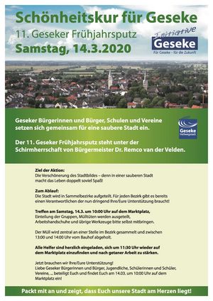 Passend zum Frühlingsanfang im März soll die Innenstadt nicht nur aufblühen, sondern auch aufgeräumt sein. Alle, die Zeit und Lust haben, sich 1? Stunden für ihre Stadt zu engagieren um das Stadtbild zu verschönern, sind herzlich zum 11. Frühjahrsputz am 14. März 2020 eingeladen: Treffpunkt: 10.00 Uhr, Marktplatz Geseke. Die Schule, die mit der größten Anzahl der Schüler teilnimmt, gewinnt den Wanderpokal.