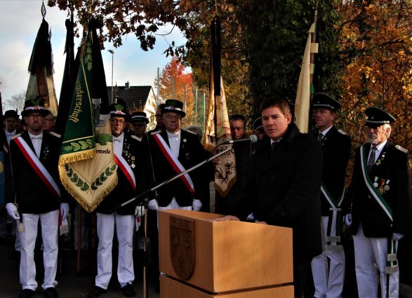 Am Ehrenmal begrüßte dann der Oberst der ausrichtenden St. Jakobus-Schützenbruderschaft Ehringhausen, Matthias Schumacher, die mehr als 150 Anwesenden und erinnerte an das Ende des Ersten Weltkrieges, dessen 100. Jahrestag am 11. November begangen wurde. Anschließend sprach Bürgermeister Dr. Remco van der Velden. In seiner Rede spannte er den Bogen vom Dreißigjährigen Krieg, dessen Ausbruch sich in diesem Jahr zum 400. Mal jährt, bis zur Gegenwart. Der Krieg war für Deutschland, aber insbesondere auch für unsere Region, das Ur-Trauma der Neuzeit. Heute erinnere man sich an die Belagerung Gesekes durch den Tollen Christian im vierten Kriegsjahr (1622). Deutlich weniger bekannt, sei die erfolgreiche Belagerung und Plünderung Gesekes elf Jahre später (1633) durch hessische und schwedische Truppen.