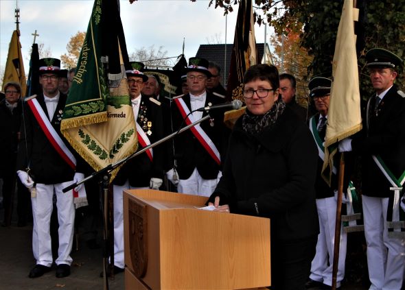 Auch Pfarrerin Kristina Ziemssen wandte sich mit einer kurzen Ansprache an die Teilnehmer der Gedenkfeier. Dabei appellierte sie an alle, endlich aus der Geschichte zu lernen. "Wir sollten Gott bitten, dass er uns zur Seite steht und uns hilft, den Weg des Friedens miteinander zu gehen", so Ziemssen.