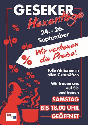 Traditionell würde Geseke vom 25. bis 27. September das Hexenstadtfest mit einem Verkaufsoffenen Sonntag feiern, aber dieses Jahr ist alles anders. Es wird kein Hexenstadtfest geben, aber die Geseker Einzelhändler bieten vom 24. bis 26. September 2020 die Geseker Hexentage an. Donnerstag, Freitag und Samstag bis 18.00 Uhr freuen sich die Händler, nicht nur in der Innenstadt, Sie persönlich zu beraten, Ihnen die neueste Herbst- und Schuhmode zu präsentieren, Trends aus der Elektronikbranche zu zeigen, Accessoires wie Schmuck oder Brillen vorzuführen oder eine Beratung zum gesunden Sitzen im Homeoffice mit Sonderpreisen auf verschiedene hochwertige Modelle anzubieten. Die Besucher erwarten tolle Ideen und verhexte Preise, mit denen sich Händler auch bei ihren Kunden bedanken möchten, die mit ihrer Treue den stationären Handel unterstützten.