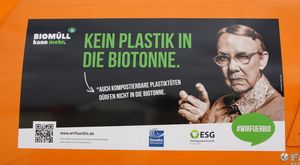 Bereits seit rund drei Jahren werden die Biotonnen im Stadtgebiet regelmäßig kontrolliert. Diese Kontrolle ist Teil der Qualitätsoffensive für Bioabfälle, die in allen Kommunen des Kreises durchgeführt wird. Eine möglichst störstoff-freie Bioabfallsammlung ist wesentliche Voraussetzung für eine hohe Kompost-Qualität. In der Tonne mit dem grünen Deckel befinden sich jedoch immer noch, neben beispielsweise Hygieneartikel oder Hundekotbeuteln, die im Handel erhältlichen Biokunststoff-Tüten. Diese Störstoffe müssen aufwändig in der Kompostieranlage aussortiert werden, denn die Biokunststofftüten unterscheiden sich nicht von normalem Plastik und verrotten nicht schnell genug. Deshalb noch einmal die wichtige Unterzeile auf der bundesweiten Kampagnenfläche #wirfuerbio "Auch kompostierbare Tüten dürfen nicht in die Biotonne". Als Alternative zu den Folienbeuteln werden Zeitungspapier und Papiermülltüten empfohlen.