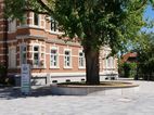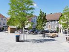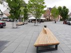 Vier große Sitzbänke mit einem Stahluntergestell sowie einer Sitzauflage und Rückenlehnen aus Robinienholz, dazu ergänzend zwei Rundbänke um die Platane und den Silberahorn laden mit Blick auf den Markplatz zum Verweilen und Entspannen ein. Die große Sitzbank am Wasserspiel wird Anfang August aufgestellt, so dass dann das geplante Mobiliar mit den Anlehnbügeln für die Fahrräder, den Abfallbehältern und den mobilen Pflanzkübeln komplett ist.