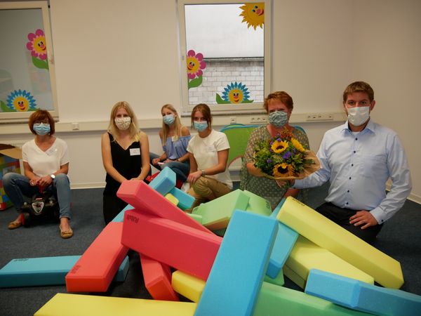 In der blauen und grünen Gruppe werden ab dem 17. August 2020 6 U-3 Kinder und 29 Ü-3 Kinder betreut. Weitere Plätze in der Ü-3 Betreuung sind noch zu vergeben. "Ich freue mich, dass wir mit Anika Wehrenberg eine kompetente Leiterin gefunden haben. Gemeinsam mit ihrem Team, drei Erzieherinnen und einer Erzieherin im Anerkennungsjahr, hat sie die besondere Aufgabe, einen Kindergarten aufzubauen und mitzugestalten. So etwas erlebt man einmal im Berufsleben," so Bürgermeister Dr. Remco van der Velden. "Gerne haben wir die Trägerschaft für den dringend benötigten Kindergarten in Geseke übernommen. So sind wir beispielsweise bei den Öffnungszeiten flexibel und können diese bedarfsgerecht gestalten." Im Moment ist die Einrichtung von 7.00 Uhr bis 16.15 Uhr geöffent. Anika Wehrenberg: "In den kommenden Tagen erfolgt eine Abfrage hinsichtlich der Öffnungszeiten bei den Eltern. Hier wollen wir entsprechend dem Bedarf die Zeiten anpassen. Wir möchten den Kindergarten gerne als Bewegungskindergarten führen und arbeiten an dem entsprechenden Konzept. Entsprechende Materialien haben wir bereits angeschafft", sagt Anika Wehrenberg. "Der Übergangskindergarten hat zwar keine Spielfläche unmittelbar am Haus. Aber wir erreichen über den Hinterhof den Spielplatz im Park Thoholte und wir wollen gemeinsam mit den Kindern die Stadt erobern und erkunden."