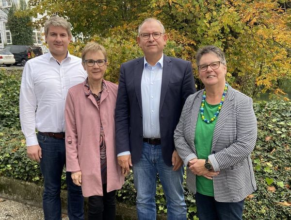 von links: Bürgermeister Dr. Remco van der Velden, Beate Haneke (Personalrat) und Birgit Dobbels (Gleichstellungsbeauftragte) gratulieren Peter Stephan (Stadtoberverwaltungsrat und Fachbereichsleiter Stadtentwicklung; zweiter von rechts) zum 40-jährigen Dienstjubiläum.