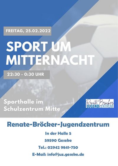 Von 22.30 Uhr bis 00.30 Uhr können in der Sporthalle im Schulzentrum Mitte in Geseke wieder Fußball, Basketball, Volleyball und vieles mehr gespielt werden. Bitte Turnschuhe mitbringen.