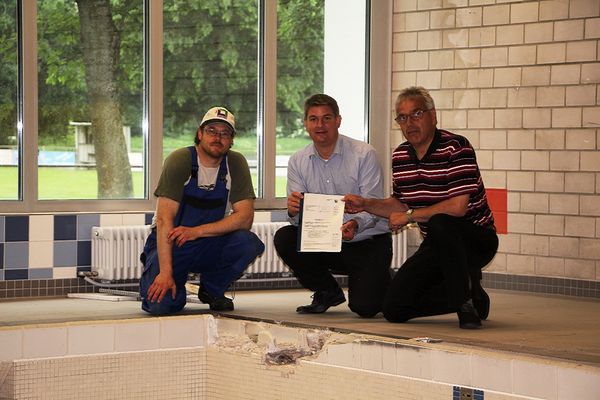 Bürgermeister Dr. Remco van der Velden: "Wir haben in den letzten Jahren mehr als 135.000 € in das Lehrschwimmbecken investiert. Sei es für die Sanierung der Dach- und Außenfassade, der Umkleideräume, die Erneuerung der technischen Steuerungskomponenten oder die Pumpen- und Wasseraufbereitungsanlage. Wenn wir nun die geplante Sanierung des Beckens und des Hubbodens abgeschlossen haben, gehen wir mit einem kernsanierten Hallenbad in die Zukunft.?