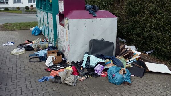 Im Bereich der Kreuzung Lüdische Straße / Ernst-von-Bayern-Straße stehen Container zur Entsorgung von Glas, Kleidung und Elektrokleingeräten bzw. Elektroschrott. Unbekannte haben diesen Containerstandort in den letzten Tagen zur illegalen Entsorgung von alten Koffern, Holzplatten, blauen Müllsäcken, Tischen und weiteres genutzt. Leere Flaschen und aufgerissene Kleidersäcke vervollständigten das Bild einer Müllhalde.