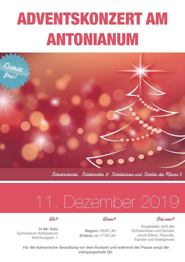 Das Gymnasium Antonianum setzt in dieser Adventszeit eine bewährte Tradition fort und veranstaltet am Mittwoch, den 11.12.2019 ab 18.00 Uhr (Einlass 17.30 Uhr) das diesjährige Adventskonzert in der Aula. Sowohl festliche als auch ruhige Advents- und Weihnachtsmusik aber auch Stücke jenseits dieses Genres werden das Programm bestimmen.