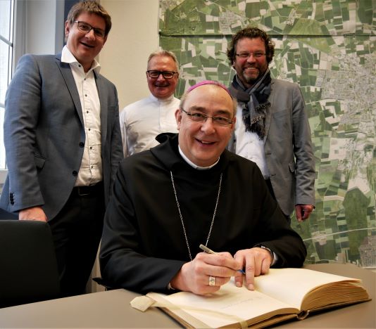 Dominicus Meier ist aktuell ein viel beschäftigter Mann: Denn der Weihbischof aus Paderborn befindet sich seit einigen Wochen auf einer so genannten Visitationsreise. Im Rahmen dieser Visitationsreise, die letztlich mehr als 400 Termine umfassen soll, machte der Weihbischof nun auch in der Hellwegstadt Station, wo er gemeinsam mit Pfarrer Rainer Stahlhacke und dem Dekanatsreferenten Thomas Mehr dem Geseker Bürgermeister Dr. Remco van der Velden einen Besuch abstattete. Gesprächsstoff gab es reichlich, ehe sich der Würdenträger aus Paderborn zum Abschluss seines Besuches dann ins Goldene Buch der Stadt eintrug.
