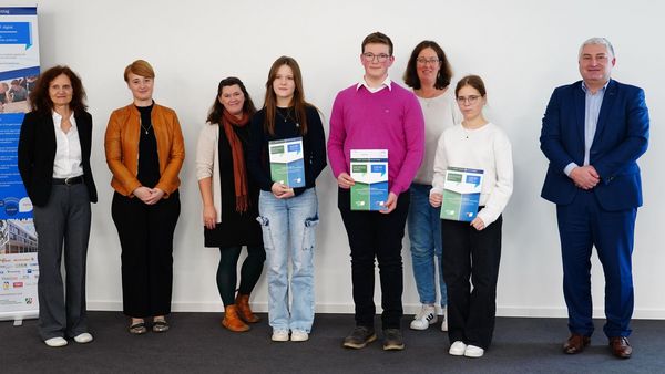 Umrahmt werden die beiden SchülerInnen von Dr. Lydia Riepe (InnoZent OWL, 1. von links), Romina Kehl (Ausbildungsleiterin der Weidmüller GmbH & Co KG, 2. von links), Dr. Marco Trienes (ganz rechts, Geschäftsführer der Wirtschaftsförderungsgesllschaft Paderborn), sowie einer weiteren Preisträgerin nebst Lehrerin.