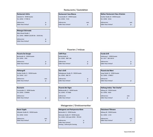 Die Liste ist nicht abschließend. Wer aufgenommen werden möchte, kann sich gerne per Mail an das Presseamt der Stadt Geseke wenden - presseamt@geseke.de -.presseamt@geseke.de