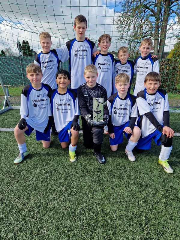 Die Jungen des Antonianum erspielten sich in teils engumkämpften Matches gegen die Drost-Rose-Realschule Lippstadt ein 5:0 und erzielten in letzter Sekunde den 3:2 Siegtreffer gegen das Friedrich-Spee-Gymnasium Rüthen. Das Endspiel gegen Werl avancierte anschließend zum absoluten Herzschlagfinale. Nach einem eher verwaltenden 2:2 wurde es in der Schlussphase sehr turbulent. Werl erhöhte zwei Minuten vor dem Ende auf 3:2 und schien als Kreismeister vom Platz zu gehen. „Wir haben eine Minute vor Schluss durch die Herausnahme des Torhüters eine Überzahl erzeugt, die glücklicherweise auch gefruchtet hat und Piet Dreier das entscheidende 3:3 erzielte“., so DFB-Lehrer Daniel Brink. Allerdings rettete kurze Zeit später der etatmäßige und wieder eingewechselte Torhüter Lorenz Heppe mit einer großartigen Parade den Sieg ins Ziel, bei welcher ihm durch die Wucht des Aufpralls doch kurz „die Luft wegblieb.“ Somit freuen sich die jüngsten Teams des Antonianum Geseke nun endlich wieder über das Double in dieser Altersklasse.