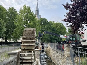Die Reparatur des Wasserrads im Ablauf des Geseker Teiches schreitet planmäßig voran. Nachdem das Wasserrad in der Innenstadt aufgrund eines schadhaften Hauptwalzlagers außer Betrieb genommen werden musste, konnten in den vergangenen Tagen wichtige Zwischenschritte abgeschlossen werden.