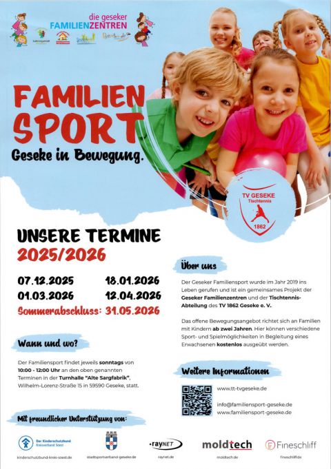 Der Geseker Familiensport wurde im Jahr 2019 ins Leben gerufen und ist ein gemeinsames Porjekt der Geseker Familienzentren und der Tischtennis-Abteilung des TV 1862 Geseke e.V.. Das offene Bewegungsangebot richtet sich an Familien mit Kindern ab zwei Jahren. Hier können verschiedene Sport- und Spielmöglichkeiten in Begleitung eines Erwachsenen kostenlos ausgeübt werden.