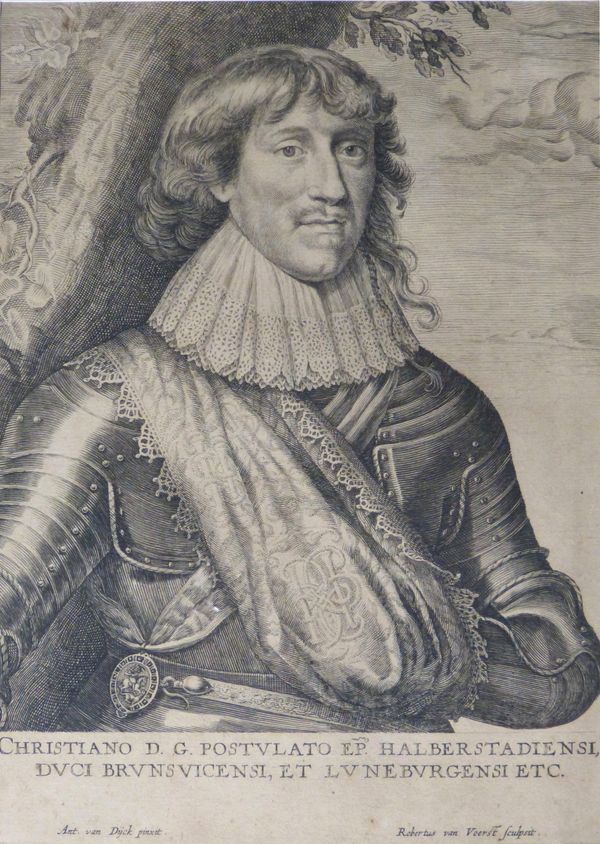 Diese beiden Drucke entstanden nach einem Gemälde von Anthonis van Dyck (* 22. März 1599 in Antwerpen - † 9. Dezember 1641 in London), der u.a. am Hof James I. in London malte. Er arbeitete also am Hof des Vaters der "Winterkönigin" Elisabeth Stuart, für die Christian von Braunschweig der Legende nach in den Krieg zog. Einer der Kupferstiche wurde von Robertus van Voerst (*1597 in Deventer - †1636 in London) gestochen, der lange mit Van Dyck zusammenarbeitete. Der Herzog ist leicht nach rechts gewandt dargestellt, im Harnisch mit Spitzenkragen, den linken Arm in einem über die Schulter gehängten Tuch, das ein Monogramm trägt. Über die andere Schulter trägt er ein Band mit dem Hosenbandorden, der an seiner Rechten in Hüfthöhe abgebildet ist. Er war ihm 1624 in London verliehen worden. Am unteren Rand des Blattes ist er als Administrator des Bistums Halberstadt und Herzog von Braunschweig und Lüneburg tituliert.