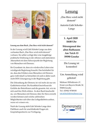 Das Demenznetz Geseke lädt am Mittwoch, 1. April, zu einer Lesung in den Sitzungssaal des Alten Rathauses ein. Ab 18 Uhr wird die Autorin Gabi Schotte-Lange aus ihrem Buch "Das Herz wird nicht dement" vortragen. Die Lesung ist kostenfrei. Anmeldungen werden erbeten unter Tel. 02942/9749185.