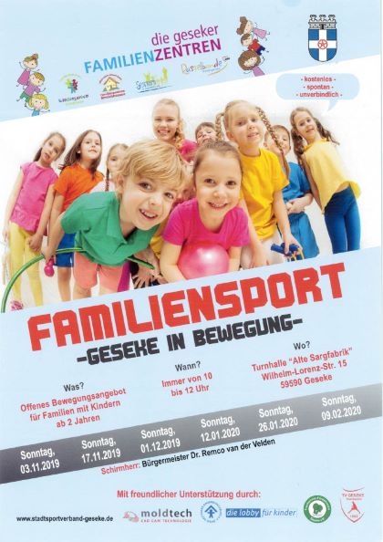 Die Geseker Familienzentren starten in wenigen Tagen eine neue Auflage der Aktion "Familiensport - Geseke in Bewegung". Das offene und vor allem kostenlose Bewegungsangebot für Familien mit Kindern ab zwei Jahren beginnt am kommenden Sonntag, 3. November. Weitere Termine sind ebenfalls jeweils sonntags am: 17. November, 1. Dezember, 12. Januar, 26. Januar und 9. Februar. Treffpunkt ist bei sämtlichen Veranstaltungen die Turnhalle "Alte Sargfabrik", Wilhelm-Lorenz-Straße 15. Von 10 bis 12 Uhr können die Kinder dann nach Herzenslust toben. Schirmherr der Aktion ist Gesekes Bürgermeister Dr. Remco van der Velden.