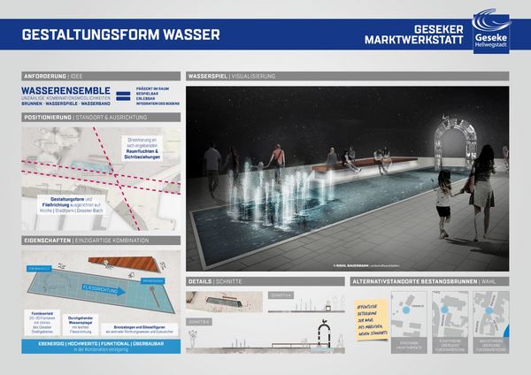 Wasser als zentrales Gestaltungselement steigert Attraktivität und Aufenthaltsqualität in öffentlichen Räumen. Auch in Geseke spielt Wasser, sowohl durch den Teich als auch den Geseker Bach und seine vielen Quellen, eine bedeutende Rolle und wird an unterschiedlichen Orten im Stadtbild sichtbar. Bereits zu Beginn des Planungsprozesses ist im Marktplatz Arbeitskreis Wasser als wichtiges Element bei der Neugestaltung definiert worden. Es soll präsent, erlebbar und bespielbar sein.