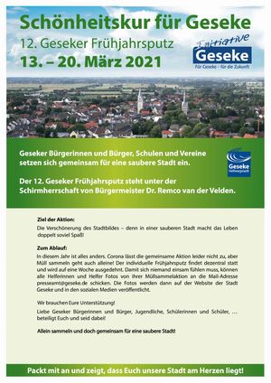 Der individuelle Frühjahrsputz findet dezentral statt und wird in diesem Jahr auf eine Woche ausgedehnt. Alle, die Zeit und Lust haben, sich für Ihre Stadt zu engagieren um das Stadtbild zu verschönern, sind herzlich zum 12. Frühjahrsputz eingeladen, der vom 12. März bis 20. März 2021 stattfindet. Damit sich niemand einsam fühlen muss, können alle Helferinnen und Helfer Fotos von der Müllsammelaktion an die Mail-Adresse presseamt@geseke.de schicken. Die Fotos werden dann auf der Webseite der Stadt Geseke und in den sozialen Medien veröffentlicht.