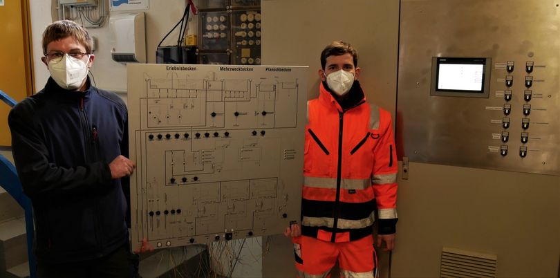 Die Steuerung der Filteranlage im Geseker Freibad funktioniert ab sofort voll digital. Während Simon Köthemann (l.) und Alexander Rudolph noch die alte Schalttafel hochhalten, ist die neue (rechts im Hintergrund zu sehen) längst installiert.