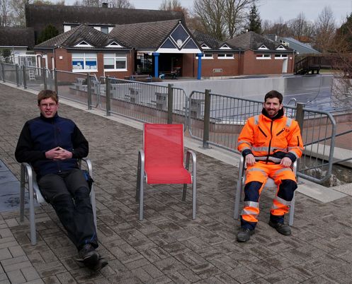 "Wir haben neue Stühle, Tische und Sonnenschirme angeschafft", verraten Alexander Rudolph (r.) und Simon Köthemann stolz. Auf den neuen Stühlen haben die beiden schon einmal probeweise Platz genommen.