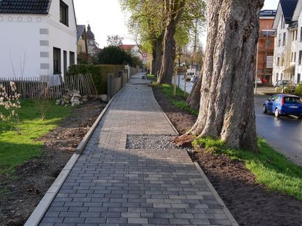 Die Umsetzung des Gestaltungskonzeptes der 2,9 km langen Wallanlage in der Innenstadt von Geseke, die zu 60% aus Mitteln der Städtebauförderung finanziert wird, erfolgt in mehreren Bauabschnitten. Im Dezember 2022 haben die Arbeiten im Wallabschnitt Ostmauer zwischen Wichburgastraße und Hellweg begonnen. Der Gehweg wurde mit versickerungsfähigem Pflaster befestigt. Entsprechend den Festsetzungen des Grünkonzeptes für die Wallanlage wurde die Baumbepflanzung ergänzt. Verbleibende Wurzelstöcke alter Bäume wurden gerodet, um so die Herstellung einer ausreichend breiten Gehwegtrasse zu ermöglichen. An einigen Stellen fällt die Gehwegpflasterung rund um den Baumwurzelbereich jedoch schmaler aus. Hier war es unter Berücksichtigung der vorhandenen Grundstückshöhen und des einzuhaltenden Gefälles nicht möglich zu pflastern, ohne die vorhandenen Baumwurzeln zu schädigen. In diesen sensiblen Bereichen wird stattdessen wird mit Dolomitsand gearbeitet.
