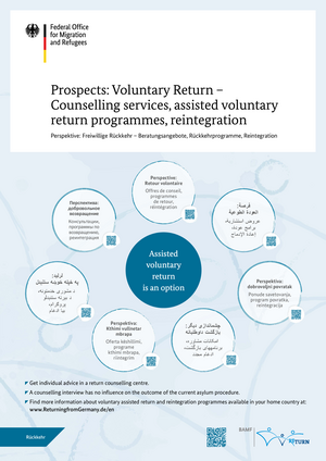 Das Informationsportal zur freiwilligen Rückkehr und Reintegration liefert zahlreiche Antworten zu Beratungsstellen, Rückkehrprogrammen, Starthilfen und weiteren Fördermöglichkeiten. Die mehrsprachige Internetseite ist unter dem Link https://www.returningfromgermany.de/de/ erreichbar.