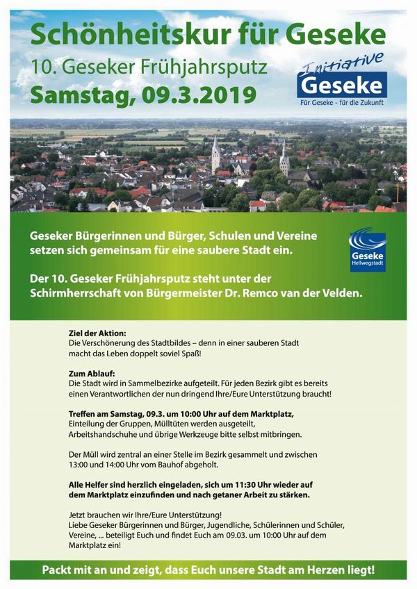 Noch ist es draußen winterlich kalt, aber passend zum Frühlingsanfang im März soll die Innenstadt nicht nur aufblühen sondern auch aufgeräumt sein. Die Initiative Geseke lädt gemeinsam mit der Stadt Geseke am 09. März 2019 alle Gesekerinnen und Geseker zum Frühjahrsputz ein, die in diesem Jahr schon zum 10. Mal stattfindet.