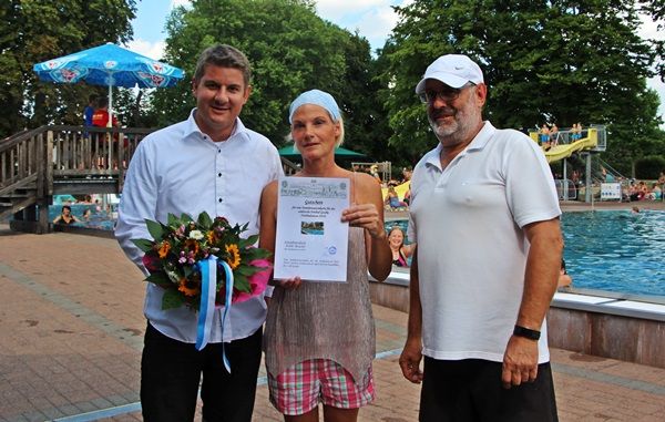 Während das trockene und heiße Wetter der vergangenen Wochen in vielen Bereichen eher Fluch als Segen ist, wirkt es sich doch äußerst positiv auf die Besucherzahlen im Geseker Freibad aus. Bürgermeister Dr. Remco van der Velden und Schwimmmeister Erwin Albat konnten nun die 50.000 Besucherin der laufenden Freibadsaison auf der Anlage am Huchtweg begrüßen. Die Gesekerin Mechthild Ruhose darf sich über eine Familiensaisonkarte für das kommende Jahr 2019 freuen.