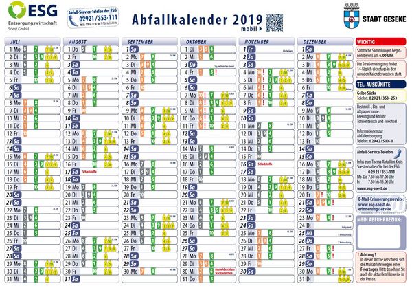 Informationen zur Abfallentsorgung, zum Tonnentausch bzw. ?wechsel oder zur Sperrmüllabfuhr erhalten Sie unter der Telefon-Nummer 02942/ 500-0 bei der Stadt Geseke.