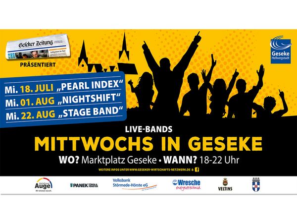 Den Besuchern werden an drei Terminen, jeweils mittwochs, tolle, in diesem Jahr rockige Konzerte unter freiem Himmel geboten. Jeweils von 18.00 Uhr bis 22.00 Uhr spielen Bands auf dem Marktplatz. Danach muss aber niemand direkt nach Hause gehen ... die Geseker Gastronome laden die Gäste in ihre Lokale ein.