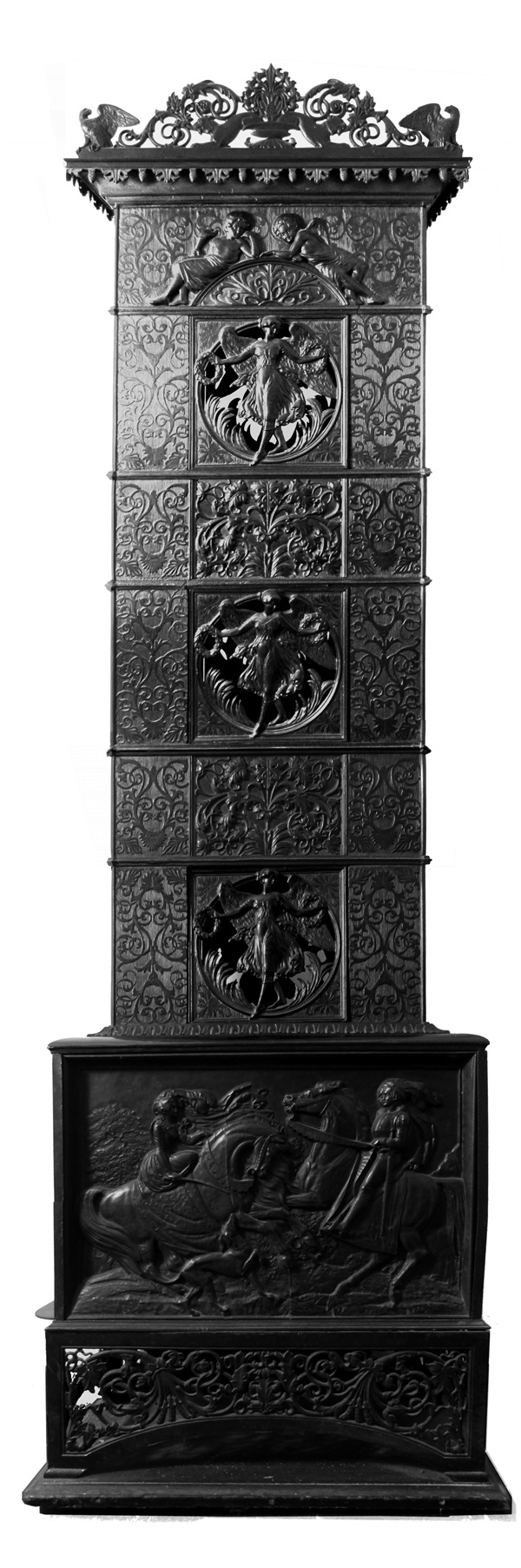 Der Ofen diente jedoch nicht nur dazu, den Raum zu erwärmen. Das wird deutlich, wenn man die filigran durchbrochene Bekrönung des Ofens mit Zierranken und Adlern in den Ecken sieht. Er sollte auch zeigen, was man sich leisten konnte. Sämtliche Teile des Ofens sind mit unterschiedlich stark plastisch ausgearbeiteten Ornamenten überzogen, die Renaissance und Barock entlehnt sind. Vorder- und Rückseite sind, bis auf den Auslass für das Ofenrohr, hinten unter der Bekrönung gleich ausgeführt. Damit boten sich viele Möglichkeiten, den Ofen im Raum zu platzieren. Es gibt auch den Namen Victoria-Ofen für dieses Stück, der sich wohl auf die beflügelten weiblichen Figuren mit Kränzen in den Händen bezieht, die die Türchen zu den einzelnen Fächern in jeder Etage zieren. Lassen wir offen, ob es sich um Genien oder Victorien handelt. Fest steht, dass sich dahinter manches Teekännchen warmhalten ließ.