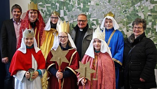 Mit Sternen und Kronen ausgestattet, machten am heutigen Freitag, 5. Januar, gleich sechs Sternsinger im Büro von Gesekes Bürgermeister Dr. Remco van der Velden Station. Neben Segenswünschen überbrachten Caspar, Melchior und Balthasar dem Stadtoberhaupt auch eine kleine gesangliche Darbietung. Von Frohsinn, Frieden und Einigkeit war dort die Rede. "Das können wir alle gut gebrauchen", bedankte sich van der Velden bei den Jungen und Mädchen. "Ich hoffe, dass für euch die Türen geöffnet werden, an denen ihr klopft. Passt unterwegs auf euch auf!", gab der Bürgermeister den Sternsingern mit auf den Weg. Begleitet wurden die Sternsinger von Pfarrer Rainer Stahlhacke und Küsterin Ingrid Josef.