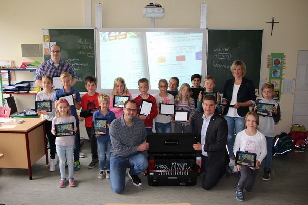 Ein Transformer Case für 16 Tablets und zeitgleicher "Sync- & Charge"-Funktion überreichte Bürgermeister Dr. Remco van der Velden stellvertretend für alle Grundschulen im Stadtgebiet an Schulleiterin Anja Karthaus von der Pankratius-Grundschule Störmede. Zeitgleich übergab Elmar Brexel vom Förderverein der Grundschule zusätzliche acht Tablets.