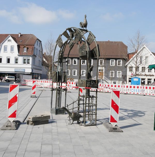 Der Künstler Werner Klenk, der den Bogen in den 1990ziger Jahren geschaffen hat, ist im Rahmen des Marktplatzumbaus von der Projektleitung, in die Planungen einbezogen worden und hat diesem Vorhaben ausdrücklich zugestimmt. Die Anpassung des Bogens an die neue Höhenlage durch Verlängerung der wasserseitigen Aufständerung, und die Aufarbeitung hat der Bildhauer Werner Klenk begleitet. Die Arbeiten wurden von der gleichen Kunstgießerei aus Münster ausgeführt, die den Bogen seinerzeit hergestellt hatte. Anekdote am Rande: Der Bogen wurde sogar vom selben Mitarbeiter aufgestellt und mit dem gleichen Anhänger angeliefert. Die Wasserspeier des Bogens sind in das Wasserspiel integriert. Der Anschluss des Bogens an die Wasserversorgung wurde von Mitarbeitern des Bauhofs installiert. Dem Ensemble werden später auch noch die auf dem Bauhof eingelagerten Gösselfiguren sowie ein Modell des Marktplatzes mit Darstellung der archäologischen Funde hinzugefügt.