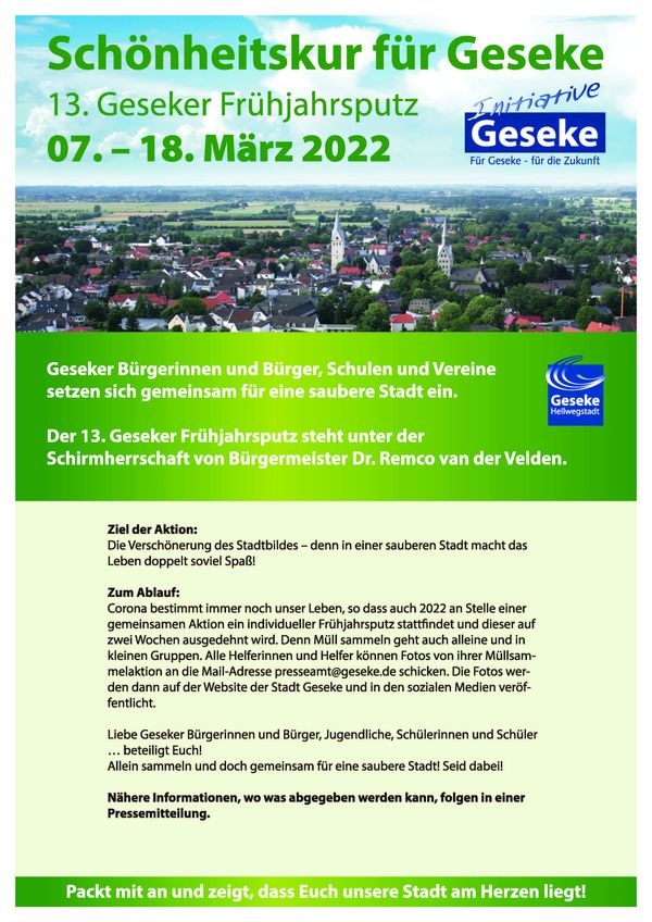 Gemeinsam mit der Stadt Geseke und vielen Bürgerinnen und Bürgern möchte die Initiative Geseke das Stadtbild gestalten, verschönern, pflegen und das Selbstverständnis für die eigene Stadt steigern. Ein Projekt ist der Geseker Frühjahrsputz. Thomas Böke von der Initiative Geseke und Schirmherr Bürgermeister Dr. Remco van der Velden: "Bereits im letzten Jahr kam das Motto „Alleine sammeln und doch gemeinsam für eine saubere Stadt“ sehr gut an. Dieses Motto möchten wir in diesem Jahr noch einmal wiederholen und wir hoffen natürlich, dass 2023 wieder eine gemeinsame Aktion an einem Samstag mit Ausklang und Verleihung des Frühjahrsputzpokals stattfinden kann. Der individuelle Frühjahrsputz, der auf Wunsch der Schulen auf zwei Wochen ausgedehnt wird, ist ein nachhaltiger Beitrag zur Festigung des Umweltbewusstseins. Bitte tragt aus Sicherheitsgründen eine Warnweste und zieht Euch Arbeitshandschule an. Die Mülltüten erhaltet Ihr bei der Stadt Geseke, meldet Euch bitte im Presseamt unter der Telefon-Nummer 02942 / 500 512. Hier bekommt Ihr auch nähere Informationen, wo der Müll entsorgt werden kann. Also, seid auch 2022 wieder unter dem Motto: „Alleine sammeln und doch gemeinsam für eine saubere Stadt!“ dabei.