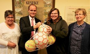 Gleich sechs neue Bälle (4x Fußball, 2x Volleyball) gehören ab sofort zum Bestand der Mobilen Jugendarbeit (MoJu) in Geseke. Genutzt werden sollen die Bälle u.a. im Rahmen des Angebotes "Sport um Mitternacht", das seit vielen Jahren erfolgreich betrieben wird. "Die Veranstaltungen sind nach wie vor sehr gut besucht und der Ballverschleiß ist daher nicht unwesentlich", weiß Anita Medic (MoJu) zu berichten. Umso passender, dass dank der Unterstützung der Sparkasse Geseke nun neue Bälle angeschafft werden konnten. Der Clou: Sämtliche Bälle entstammen der "BadBoyz"-Ballfabrik in Nürnberg und sind somit Fairtrade-zertifizert. "Die Idee, Fairtrade-Bälle für das Jugendzentrum anzuschaffen, kam von einer Mitarbeiterin unseres Hauses", schildert Heinz Gockel von der Sparkasse Geseke. "Wir waren von der Sache sofort begeistert und haben daher gerne die Bälle besorgt."