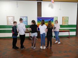 Alle zwei Jahre findet der Aktionstag an einer Schule statt. In diesem Jahr war das Team, zu dem auch Swetlana Ritter und Dorothee Schrader vom Renate-Bröcker-Jugendzentrum Geseke gehören, in der Sekundarschule Geseke. Insgesamt acht Klassen der Stufen 7 und 8 haben am 17. Mai 2022 den Parcours durchlaufen. Angefangen mit einem kleinen Clip, der sich mit Gemeinschaft und Ausgrenzung durch beispielsweise Mobbing und sexuelle Orientierung beschäftigt, ging es für die Schülerinnen und Schüler in kleinen Gruppen zu den einzelnen Aktionen. So konnten sich die Jugendlichen eine Comicausstellung anschauen, die sich mit wahren Alltagsgeschichten / Erlebnissen beschäftigt, an einem Quiz teilnehmen und sich kreativ an der Fotobox ausprobieren.