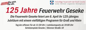 Die Freiwillige Feuerwehr der Stadt Geseke richtet am Samstag, 06. April 2019 den Kreisfeuerwehr-Verbandstags aus. Gleichzeitig wird das 125-jährige Jubiläum des Löschzuges Geseke gefeiert. Beide Veranstaltungen finden auf dem Schützenplatz und in der Schützenhalle in Geseke statt. Der Eintritt ist frei. Lediglich für die Party am Abend ab 19.00 Uhr ist Eintritt zu zahlen.
