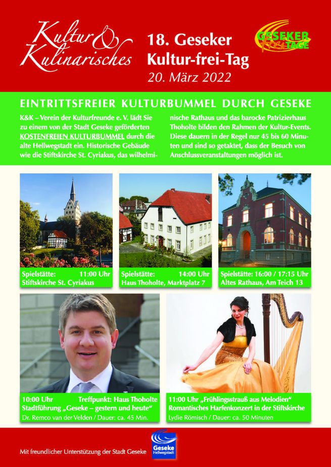 Bereits ab 10.00 Uhr beginnt das Programm des Vereins der Kulturfreunde e.V., der alle Interessierten zum Kultur-frei-Tag, zu einem Kulturbummel durch Geseke und zum kostenfreien Besuch der angebotenen Kulturevents einlädt. Die Events finden im Stundentakt statt und dauern in der Regel jeweils ca. 45 bis 60 Minuten.