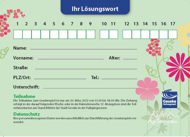Bitte geben Sie die Teilnehmerkarten am Stand bzw. Hütte der Stadt Geseke am 20. März 2022 in der Fußgängerzone ab.