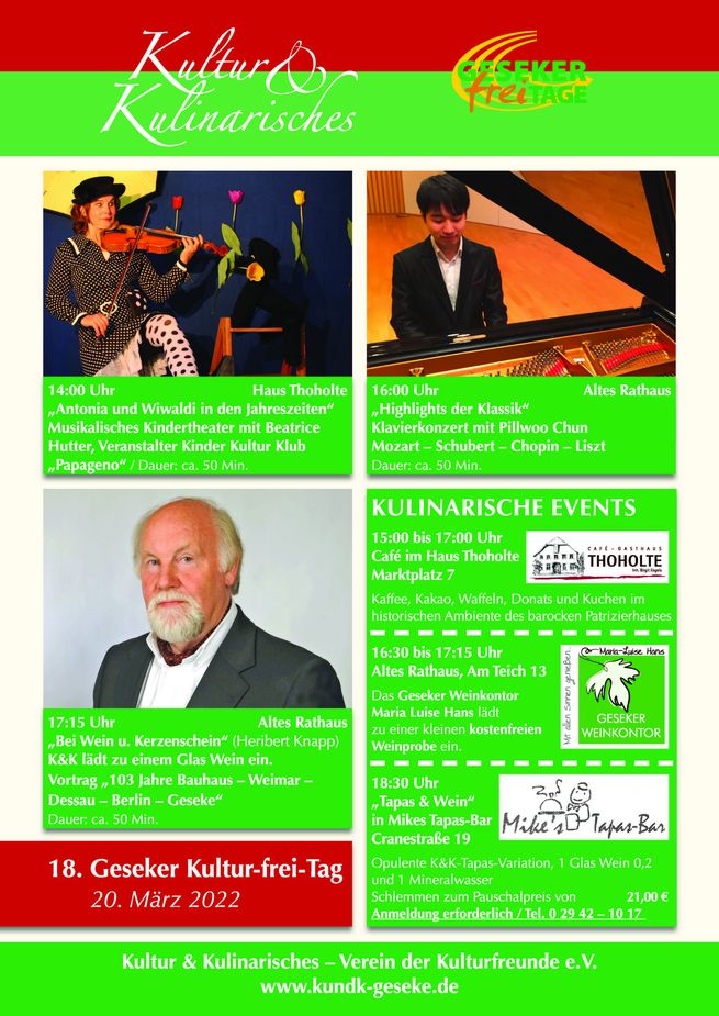 Das unter dem Motto Kultur-frei-Tag in Geseke angebotene vielseitige Programm, das von einer historischen Stadtführung durch Bürgermeister Dr. van der Velden über einen Vortrag der Reihe „Bei Wein und Kerzenschein“ mit Heribert Knapp zum Thema Bauhaus und ein musikalisches Kindertheater bis hin zu zwei Konzerten reicht, soll einen kleinen Einblick in das breite kulturelle Spektrum der alten Hellwegstadt geben und Lust auf Geseke machen.