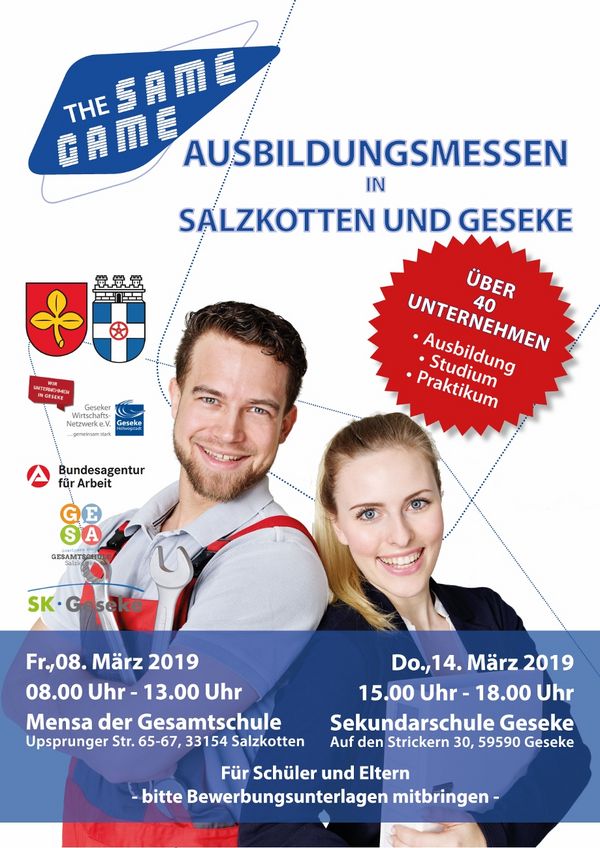 Morgen, also am 14. März 2018, veranstaltet das Geseker Wirtschafts-Netzwerk e.V., die Stadt Geseke sowie die Agentur für Arbeit Lippstadt, die zweite Auflage der "GAME - Geseker AusbildungsMesse". Von 15 bis 18 Uhr haben alle Schülerinnen und Schüler die Möglichkeit, eigenständig die 45 ausstellenden Unternehmen und Institutionen zu besuchen und sich über die offenen Ausbildungsplätze zu informieren. "Bringt vollständige Bewerbungsunterlagen mit. Vor Ort können bereits erste Gespräche mit den Unternehmen geführt werden. Die Agentur für Arbeit bietet auch wieder ein Bewerbungsmappen-Check an", lädt das Organisatorenteam des Geseker Wirtschafts-Netzwerkes die Schülerinnen und Schüler zum Besuch ein.